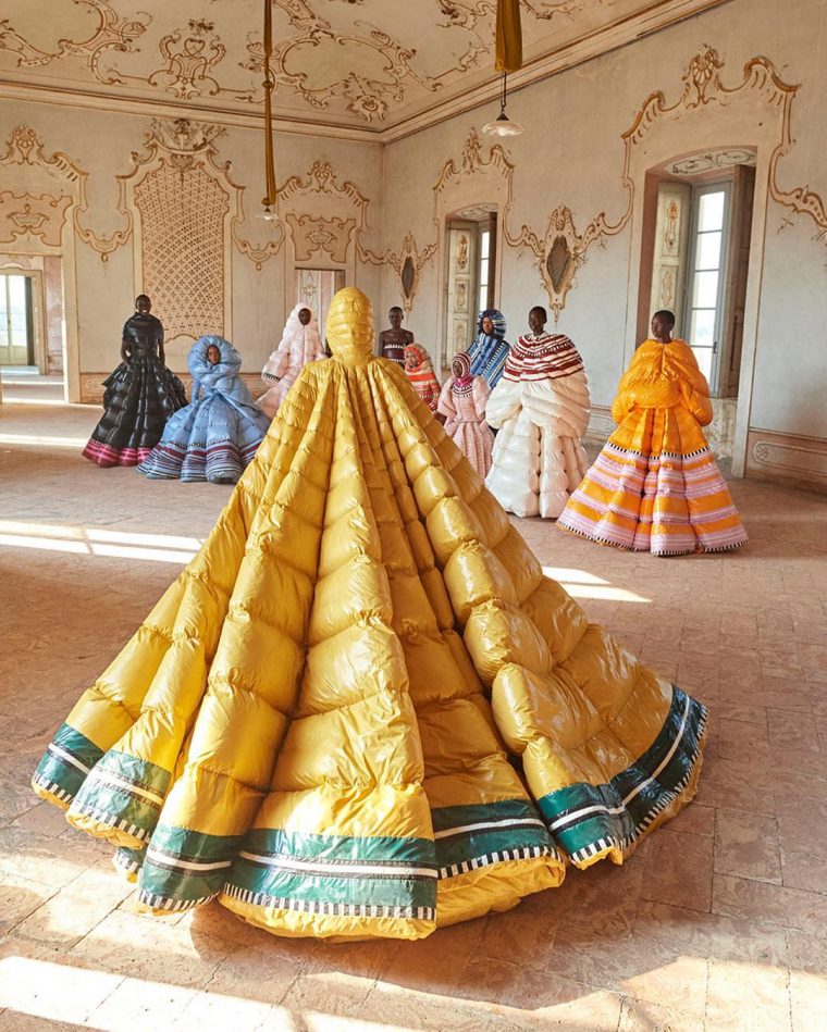 В этом году дизайнер Пьерпаоло Пиччоли в капсульной коллекции для Moncler Genius представил пуховик-кейп и пуховик-платье в пол.