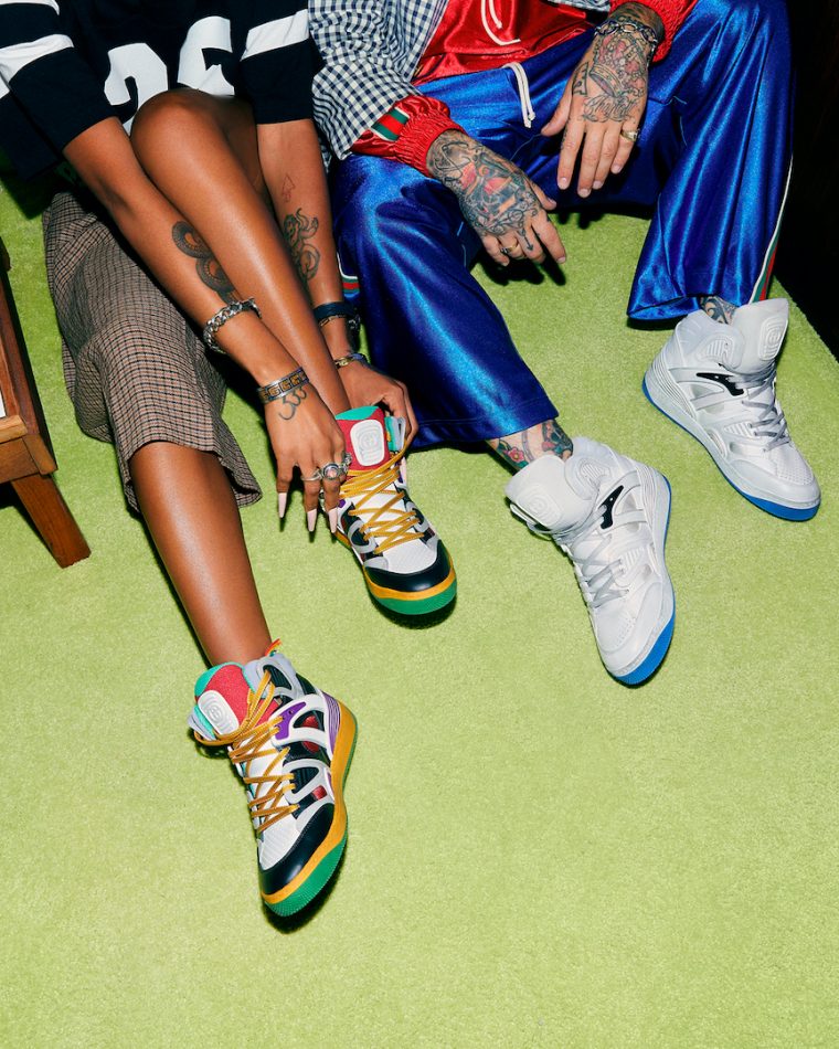 Последние два сезона в тренде высокие баскетбольные кроссовки – хайтопы. Вдохновляясь стилем 1990-х, Gucci представили модель Basket в технике колор—блок: фуксия и зеленый, синий и желтый. Примечательно, что кроссовки выполнены не из кожи или замши, а из инновационного перерабатываемого экоматериала «Деметра», созданного маркой.