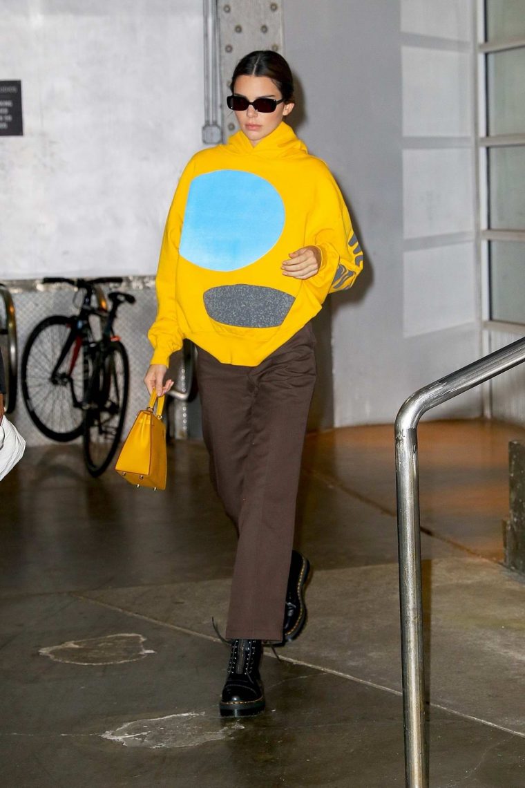 В таком оттенке хорошо будут смотреться не только летящие платья и юбки А-силуэта, но и спортивные вещи. Например, в гардеробе Кендалл Дженнер полно желтых худи, ветровок и флисовых курток.