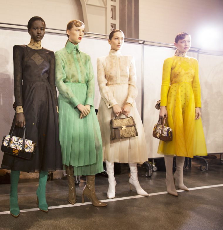 Шоу Fendi стало трибьютом Карлу Лагерфельду. Эта коллекция оказалось последней созданной под руководством маэстро: идеально скроенные блузки и платья миди, широкие брюки, жакеты из спортивной сетки, авиаторские кепи из овчины, а колготки и водолазки украшали инициалы Лагерфельда.
