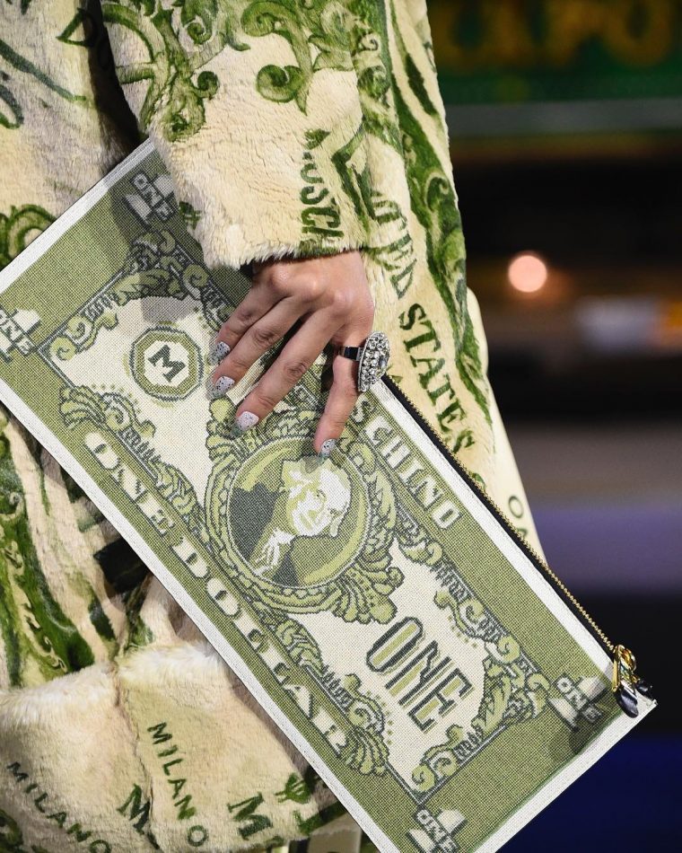 Креативный директор Moschino Джереми Скотт стилизовал показ под казино. На подиуме были установлены игровые автоматы, модели демонстрировали вещи с принтом в виде долларовых купюр, а сам дизайнер, выходя на финальный поклон, сел в «призовую» красную машину.