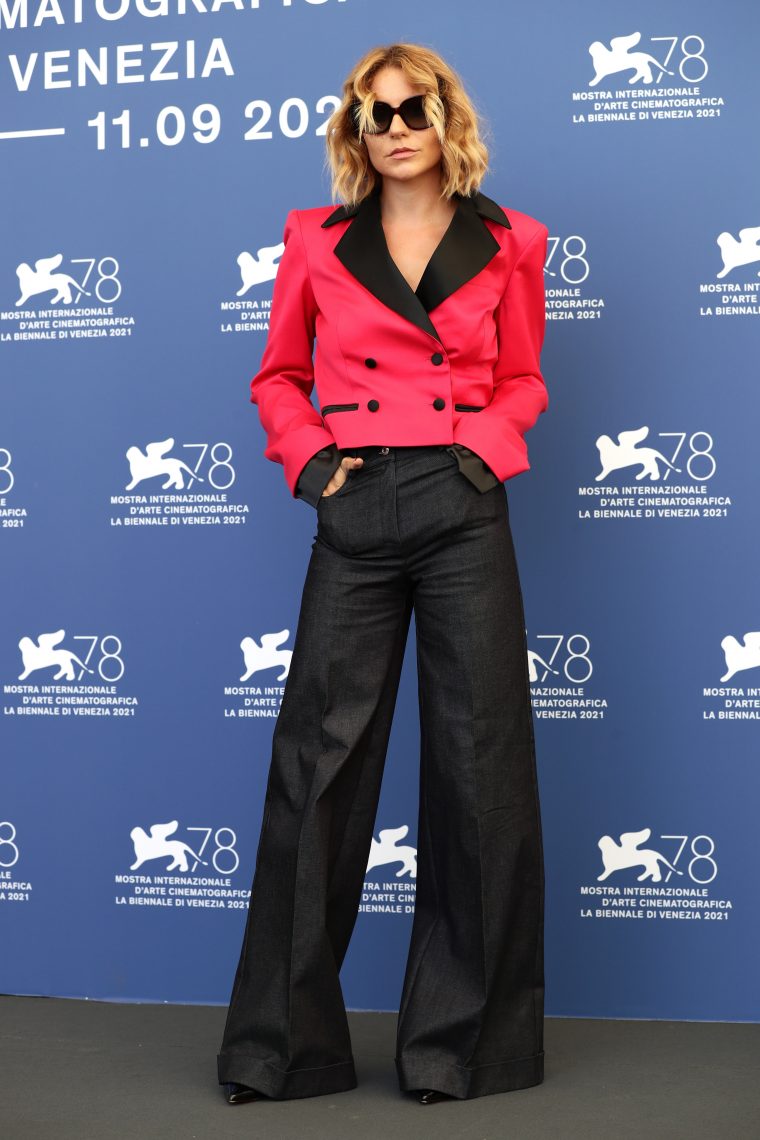 Кроп-жакет можно носить застегнутым на все пуговицы вместо блузки, например, с брюками на высокой талии в тон – в офис и на деловые мероприятия. Так на фотоколл Венецианского фестиваля приходили актрисы Дакота Джонсон, Тильда Суинтон и Сара Гадон.