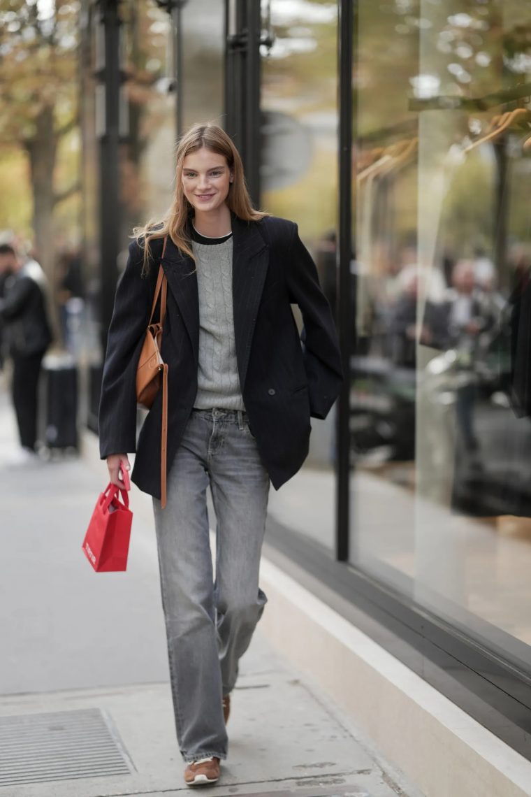 Вневременной, но в то же время молодежный образ дополнят классические прямые синие джинсы.