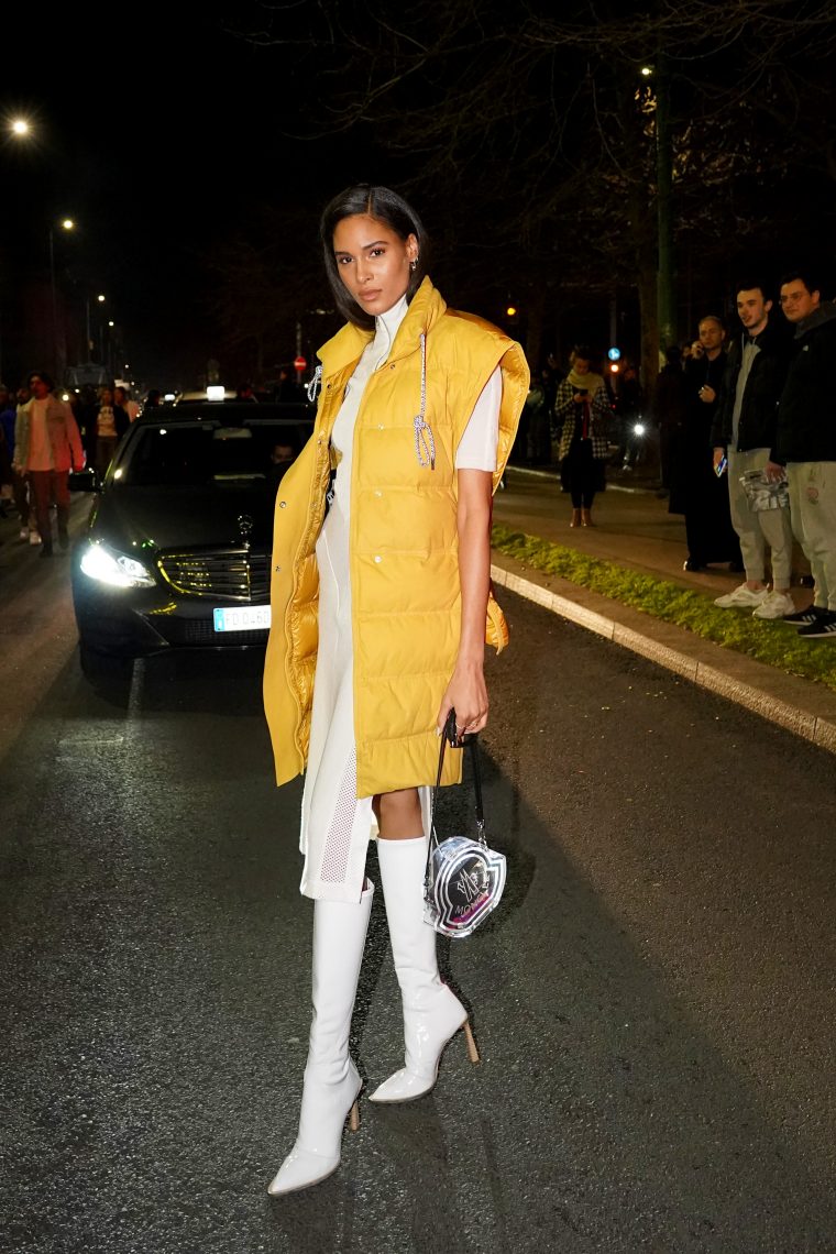 Во-первых, он сложный, многогранный, а значит, сделает интереснее любую вещь, даже самого простого кроя. Только посмотрите на модель Синди Бруну в пуховом жилете. Благодаря необычному оттенку куркумы он вписался даже в ее вечерний образ.