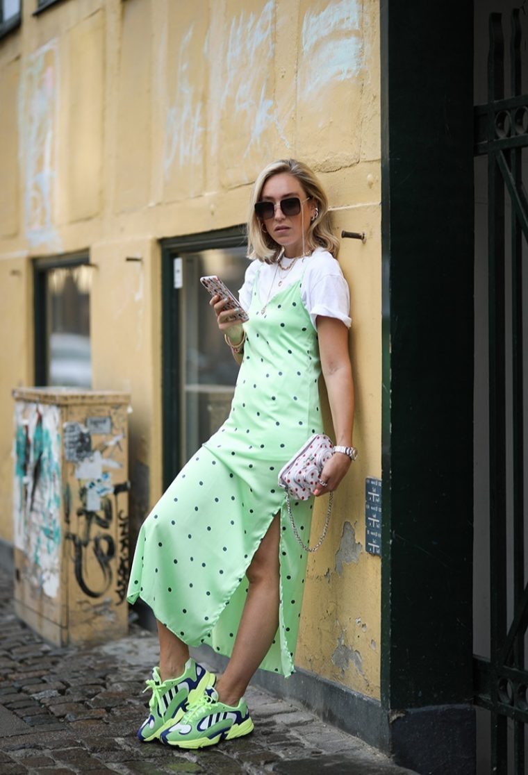 Платье-комбинацию без кружева отлично «работает» и днем, в более повседневных образах. Попробуйте надеть его на водолазку, рубашку или однотонную футболку, например, с кроссовками. Или с джинсами в роли туники. Одно платье – минимум пять образов!