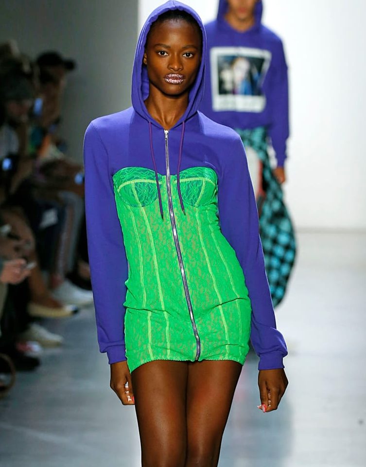 Именно в такой гамме были популярны спортивные костюмы в 1980-е. Тогда носили объемные олимпийки и тренировочные штаны, сегодня предпочтительны более сексуальные силуэты – худи, футболки с миниплатьями и корсетами. Аксессуары подбирайте под стать – со спортивным настроением.