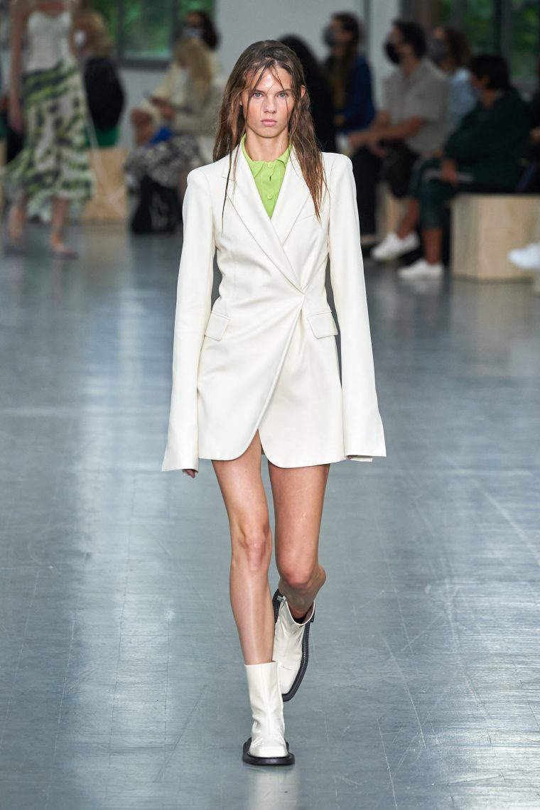 Плиссированные юбки ниже колена появились не только в романтичной коллекции Jacquemus, но и у «уличных» марок, вроде Off-White и Balenciaga.