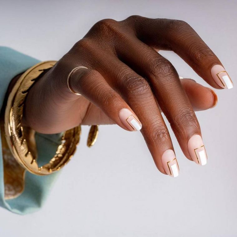 В тренде квадраты, треугольники и ромбы. Можно даже ограничиться одной толстой прямой линией по центру ногтя. Смотрите, какой чертеж вам симпатичнее, и выбирайте сдержанные оттенки.