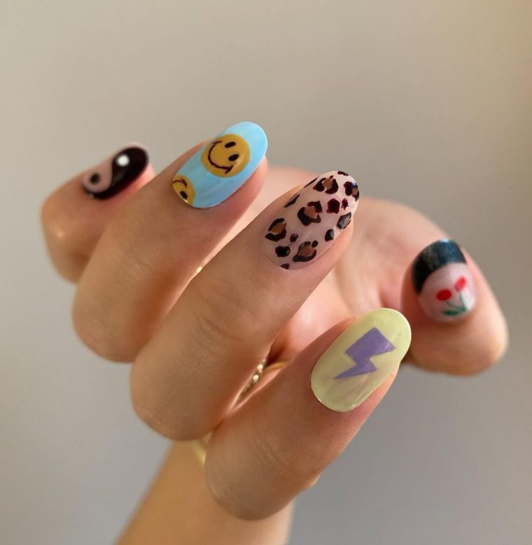 У каждого ногтя – свой дизайн. Скажем, желтый смайлик на безымянном пальце, символ инь-ян – на указательном и анималистический принт – на мизинце. Получается вроде бы случайный набор, но вместе смотрится органично. Мастер может рисовать от руки или использовать наклейки.