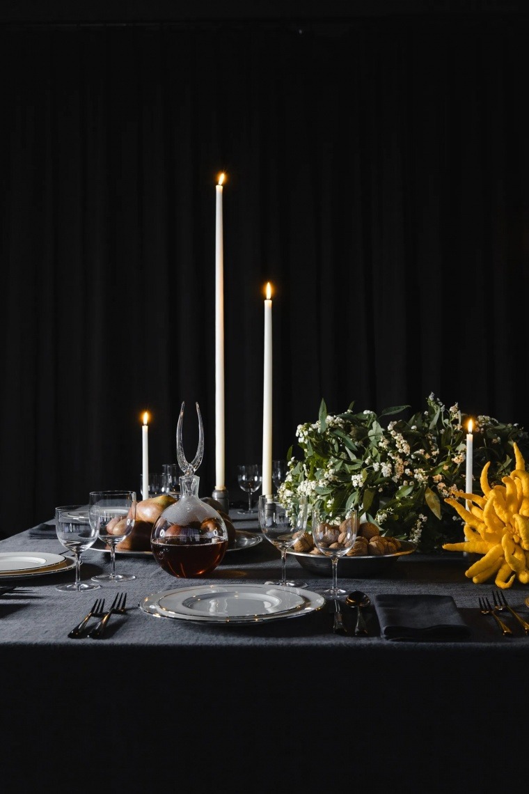 И на праздники Николь Холлис не расстается со своим фирменным черным цветом – скатерти и салфетки. Стол украшают сосновые шишки, фрукты, букеты белых цветов и свечи, матовое серебро, хрусталь, серебряные шары – все на темном фоне. Несколько штрихов цвета привносят блеск этому темному праздничному столу.