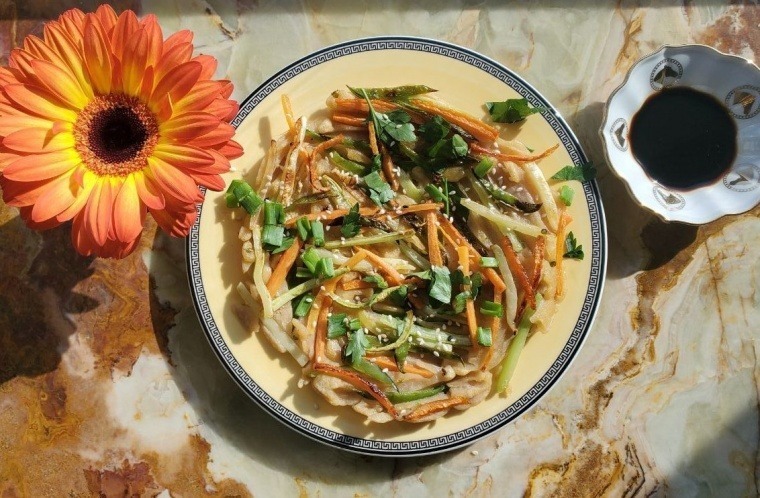 Корейский овощной ячеджон, несмотря на свою экзотичность, вполне удовлетворяет нашу масленичную тягу к углеводам – он очень вкусный и сытный. А если подать с соусом на основе соевого, то пальчики оближешь!