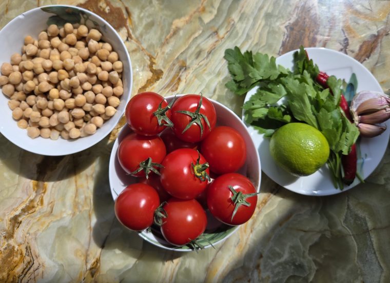 - Помидоры черри разрежьте пополам и выложите в салатницу к нуту. Полейте соком лайма, перемешайте. Украсьте листьями кинзы.