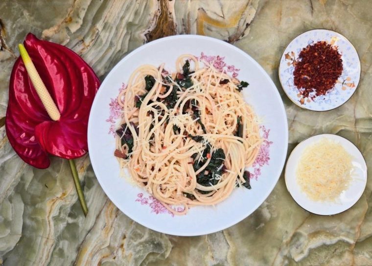 - Тонко нарежьте чеснок. В большой сковороде нагрейте 2 столовые ложки оливкового масла и жарьте на среднем огне чеснок с хлопьями красного перца, пока овощи не начнут давать аромат – примерно 2-3 минуты.