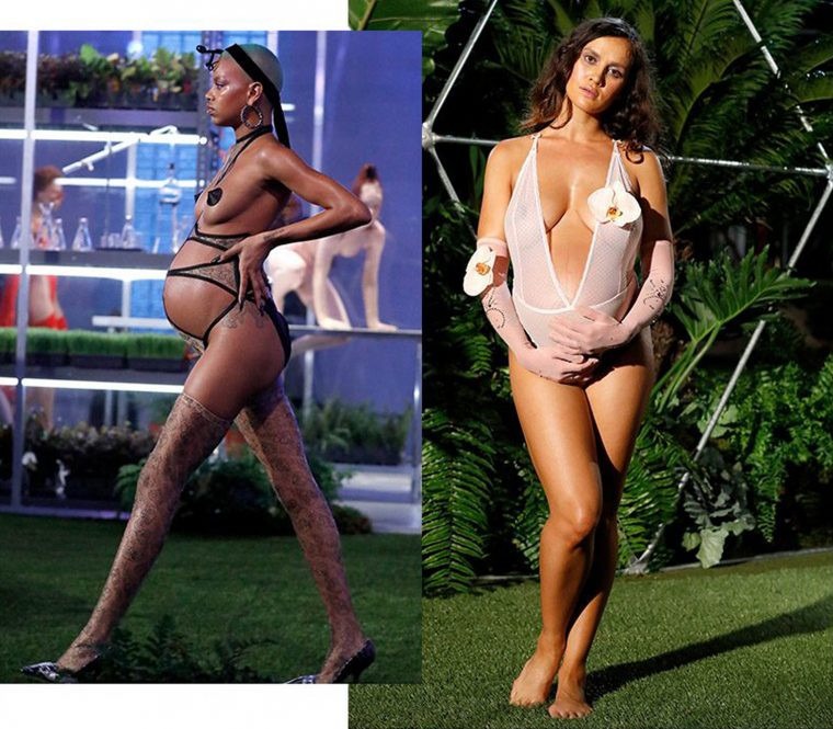 Выглядела девушка весьма эффектно – кружевные чулки с люрексом, гигантские серьги-кольца, шпильки, а вместо лифчика – нашлепки на соски. К ней присоединилась вторая беременная модель, которая демонстрировала сетчатое боди с глубоким декольте. А на показе новой марки Eckhaus Latta вышагивала художница Майя Рут Ли в обтягивающем платье оттенка пудры с расстегнутыми на животе пуговицами.