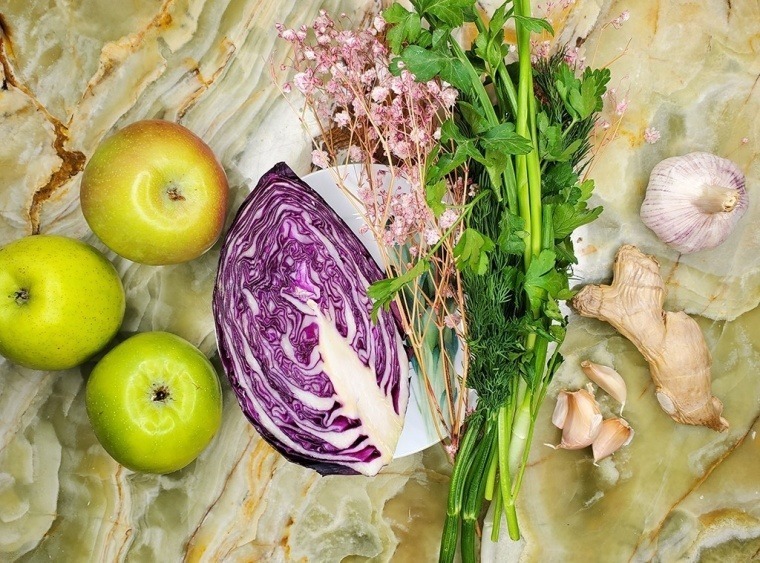 Краснокочанная капуста – это клетчатка, кладезь витаминов А и С, цвет ей дает антиоксидант антоциан. Грейпфрут содержит ликопин – еще один антиоксидант, который придает ему розовый оттенок. Горечь грейпфрута и зеленого лука уравновешивает сладость морковки и яблока. И как все здорово хрустит! Как в детстве!