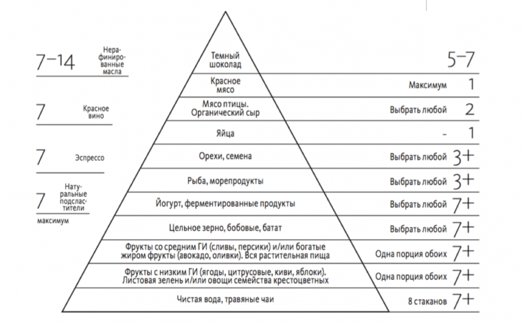 В конце книги Москони приводит схему пищевой пирамиды, укрепляющей умственные способности. Главное – получать достаточно продуктов, составляющих основу пирамиды, а цифры на полях обозначают, сколько раз в неделю вы можете есть этот продукт.