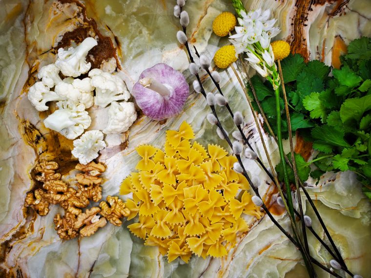 - Перемешайте пасту с цветной капустой и чесноком. При небоходимости добавьте немного жидкости, которая осталась от пасты. Разложите по тарелкам и посыпьте орехами и петрушкой.