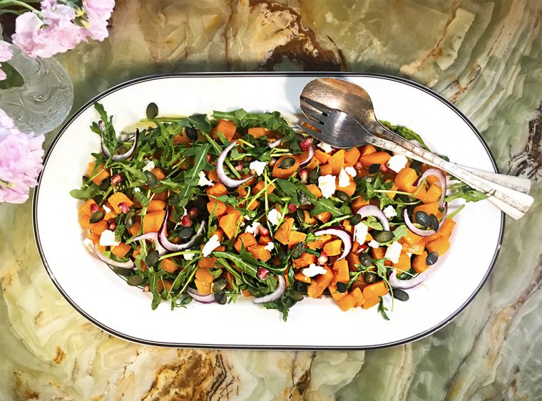 Это идеальный салат для зимнего ужина – питательный, но не тяжелый, наоборот, в меру полезный и зеленый, с неожиданными сочетаниями – сладкой запеченной тыквы и соленого сыра, пряной медово-горчичной заправки и свежей горьковатой рукколы, кисло-сладкого граната и острого красного лука.