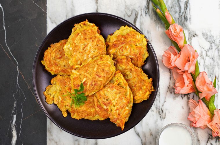 - Миксером смешайте сельдерей, муку, яйца, чеснок и зелень. Из полученной массы сформируйте оладьи и обжаривайте их с каждой стороны по 2-3 минуты. Накройте крышкой и доведите оладьи до готовности на медленном огне или в духовке в течение 10–15 минут.