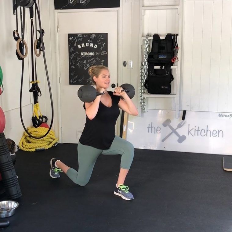 Недавно Бруно поделился фрагментом видео с тренировкой Кейт, на котором видно, что она делает обратные выпады на ногу с 24-килограммовой гирей в руках.